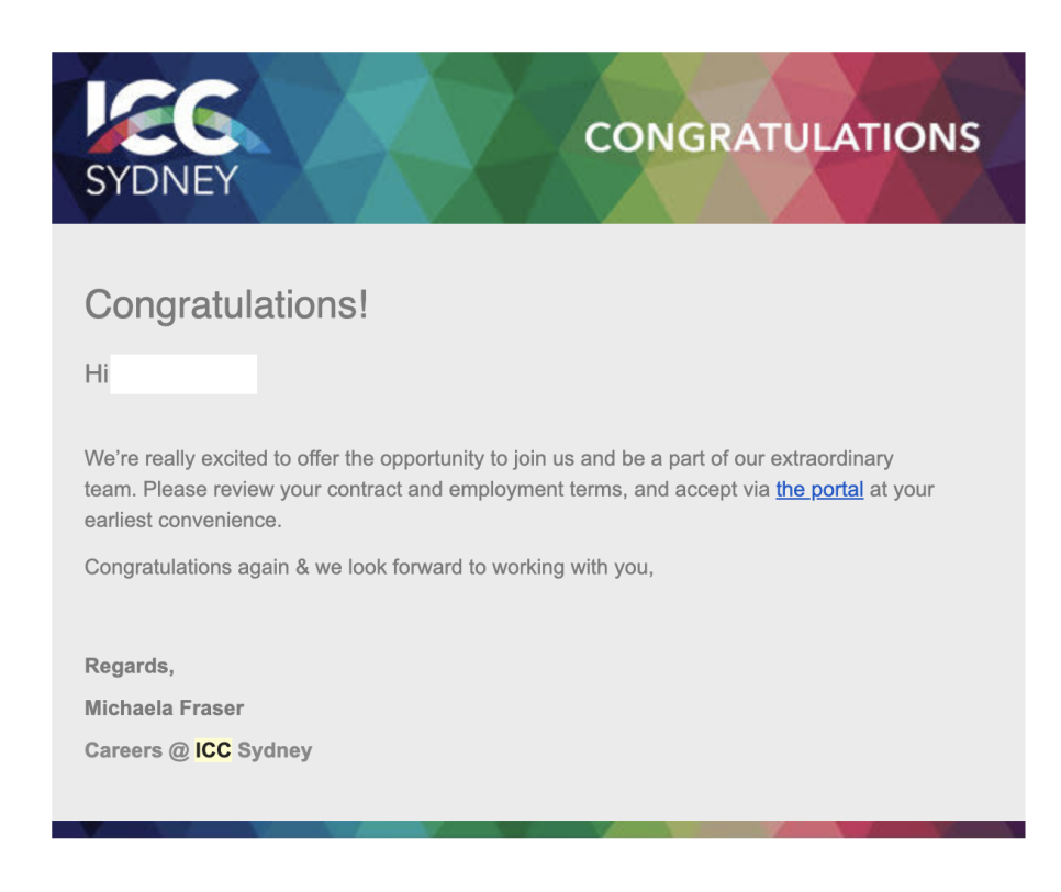 Thank you for your recent application for our Food and Beverage Team Member role at ICC Sydney. We are pleased to advise you have been successful in progressing to the next stage of the recruitment process. ( ...이하 생략)